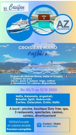 Découverte d’IsraëlVous êtes ici : Accueil/ découverte d’Israël Cliquer ici pour réserver votre croisière du 30 nov au 11 déc Cliquer ici pour vous inscrire au séjour à l'Hôtel Dan - Eilat Cliquer ici pour vous inscrire au séjour à La MER MORTE Cliquer ici pour vous inscrire au séjour à l'Hôtel Sheba - Eilat