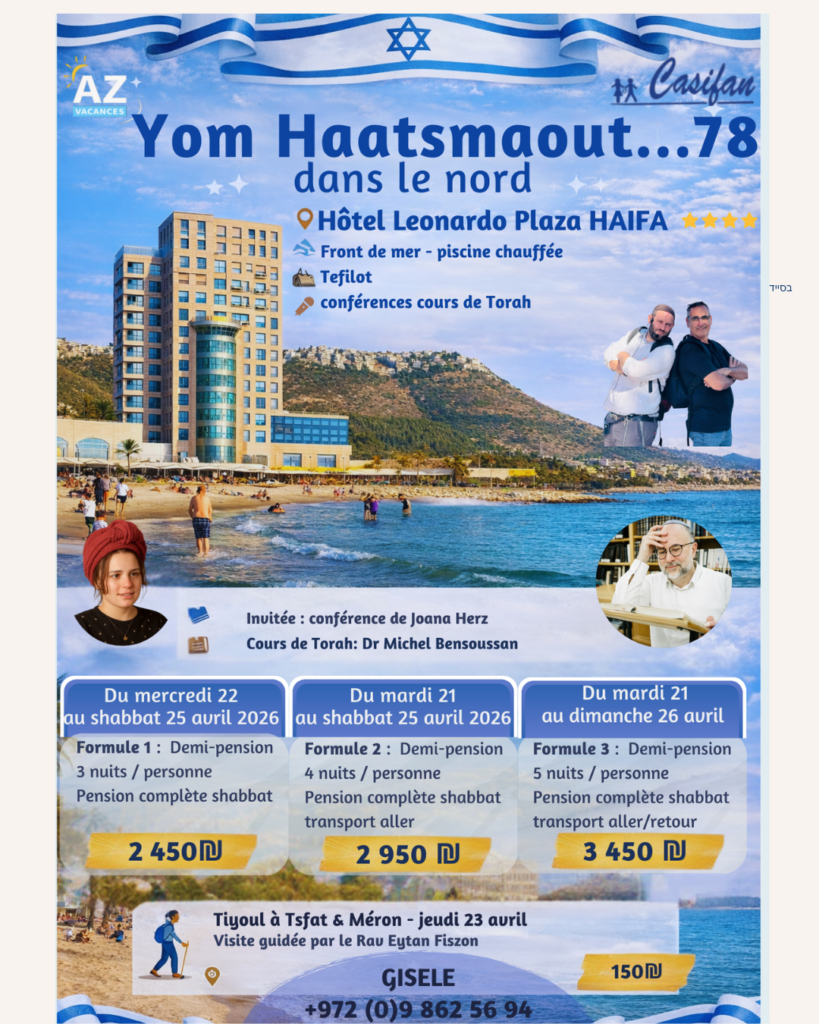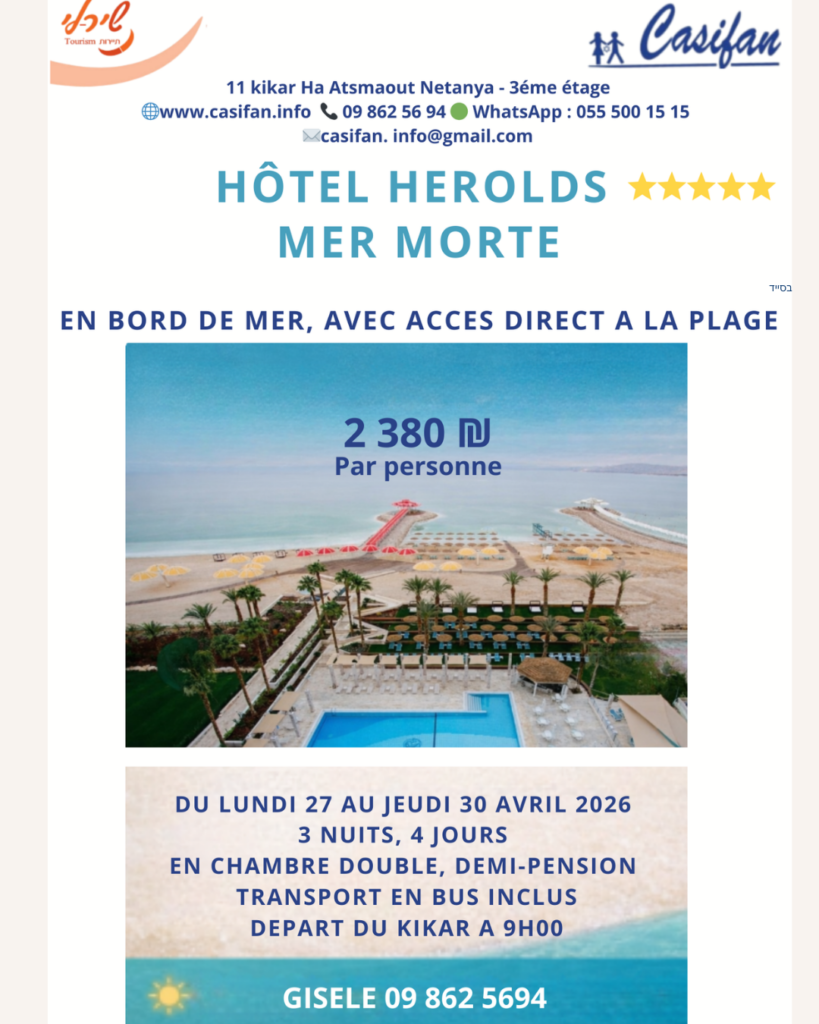 • 22–25 avril 2026 (3 nuits) – 2 450 ₪